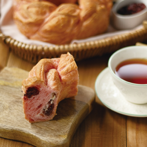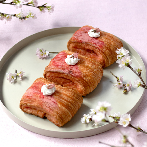 クロワッサン生地に桜の香りのダマンドとシロップ漬けチェリーを挟み、桜パウダーと花びらで華やかに仕上げました。