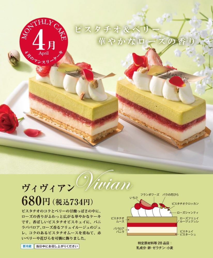 ピスタチオのコクとベリーの甘酸っぱさの中に、ローズの香りがふわっと広がる華やかなケーキです。