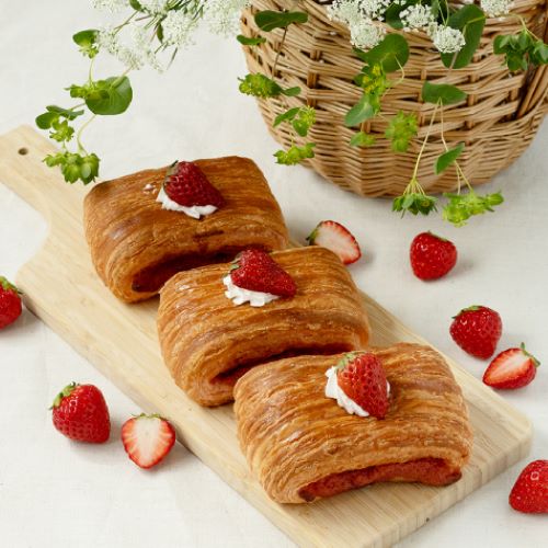 甘い香りのピンクの生地に、アーモンドクリームと苺チョコをサンド。さらにフレッシュな苺をトッピングしました。
