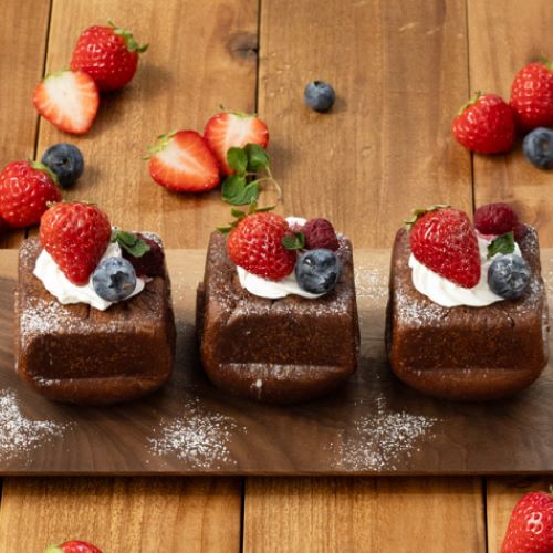 チョコ味の生地に、ラズベリーチョコクリームを包み込み、ブルーベリー、ラズベリー、苺をトッピング。