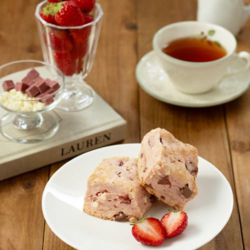 ホワイトチョコレートと、いちごチョコレートが入った口溶けやさしいスコーンです。