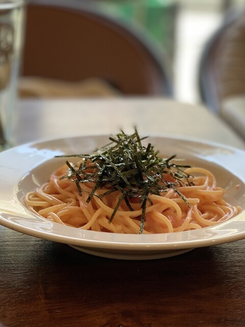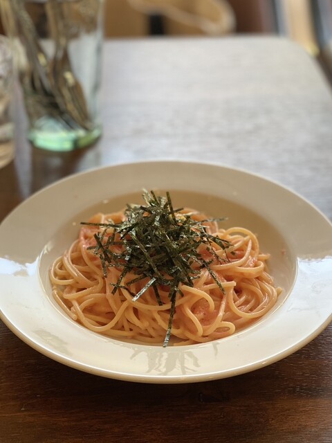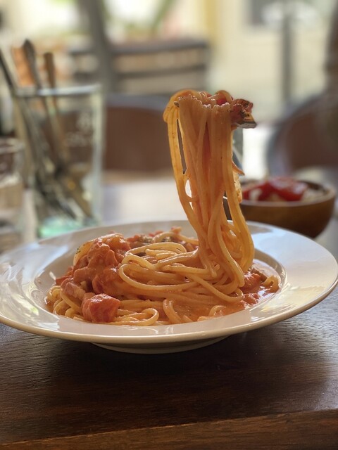 パスタは、量は普通サイズ、艶のある茹であがりの麺。