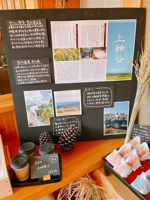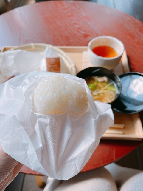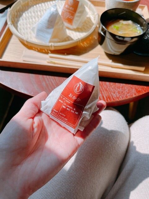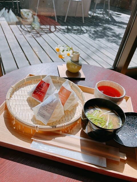 地元の上神谷(にわだに)米を使ってつくられた数種類のおむすびと、日替わりのお味噌汁がいただけます。