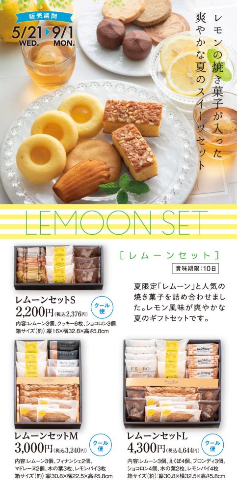 夏限定「レムーン」と人気の焼き菓子を詰め合わせました。レモン風味が爽やかな夏のスイーツセット