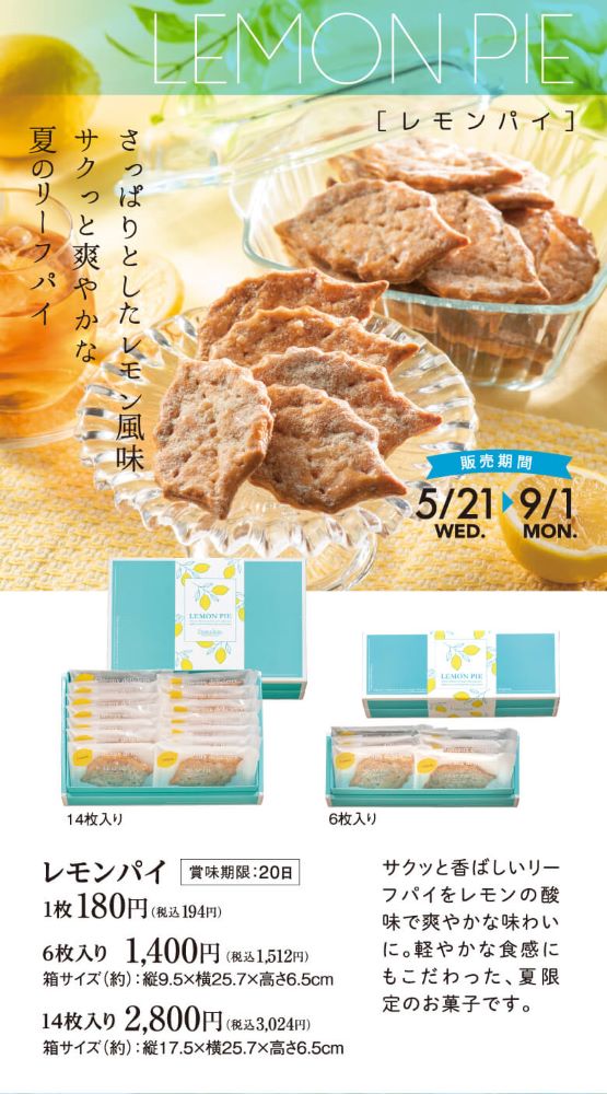 サクッと香ばしいリーフパイをレモンの酸味で爽やかな味わいに。軽やかな食感にもこだわった、夏限定のお菓子です。