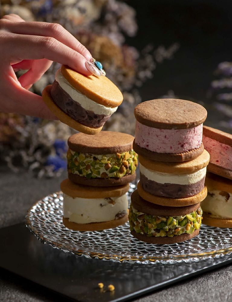 芳ばしいピスタチオのバタークリームをココアサブレで挟み、ローストしたピスタチオを贅沢に散りばめました。
