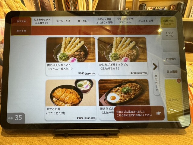 ごぼ天肉うどんとミニぼた餅をタッチパネルで