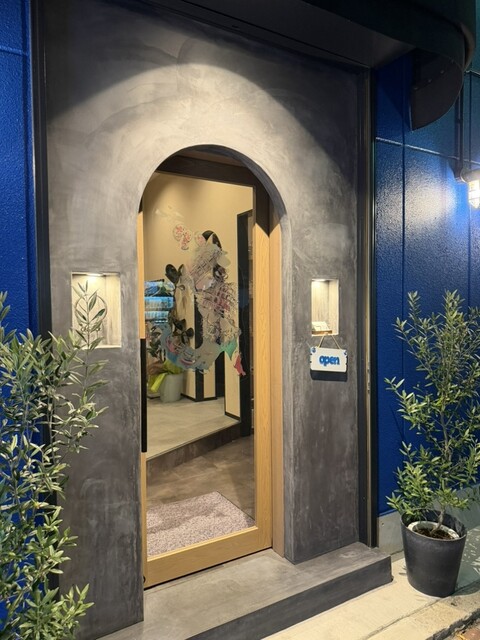 青い壁にアーチのドアが可愛い♡