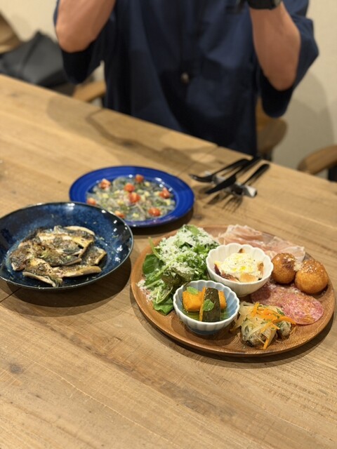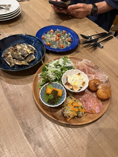 前菜はいちじくのカプレーゼ、こあじのエスカベッシュ、かぼちゃのバニラ風味、シチリアのコロッケなど色々あっておいしい♡