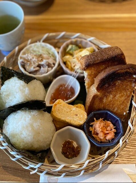 おにぎりとトーストがセットになった