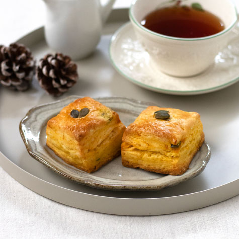 サクサクホロホロ食感のカボチャ味スコーン。見た目もかわいらしく、おやつにぴったりです。
