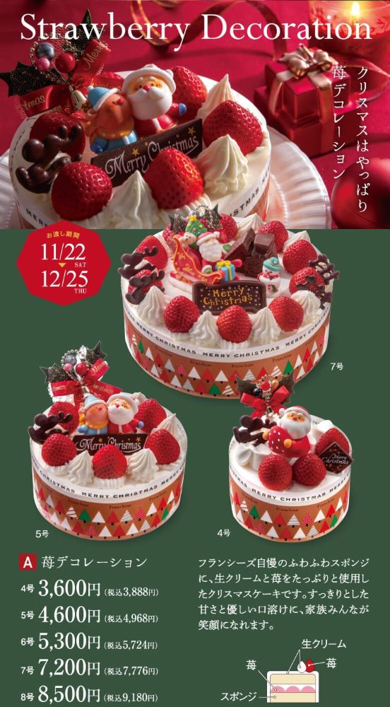 フランシーズ自慢のふわふわ」スポンジに、生クリームと苺をたっぷりと使用したクリスマスケーキです。すっきりとした甘さと優しい口溶けに、家族みんなが笑顔になれます。