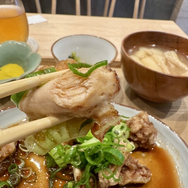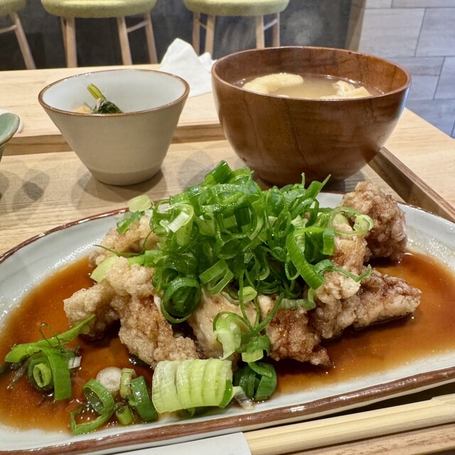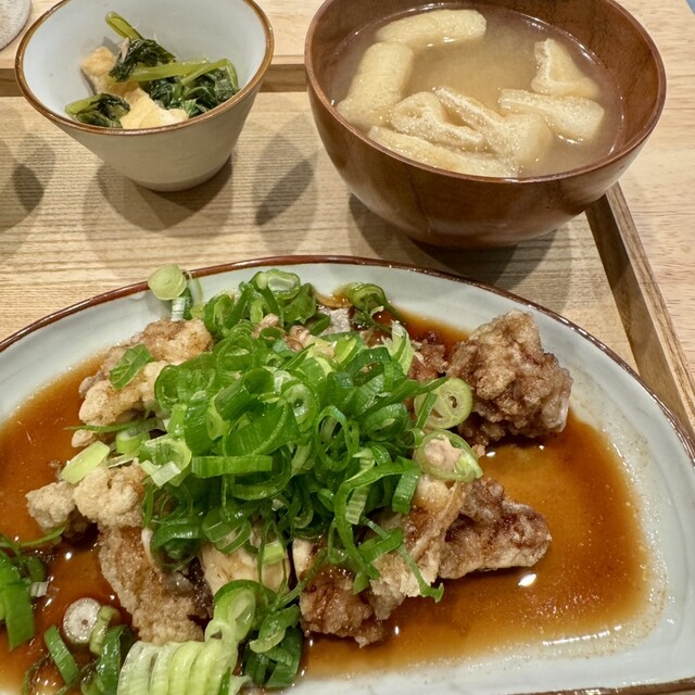 唐揚げのぶつ切りした上にたっぷりの刻みネギ