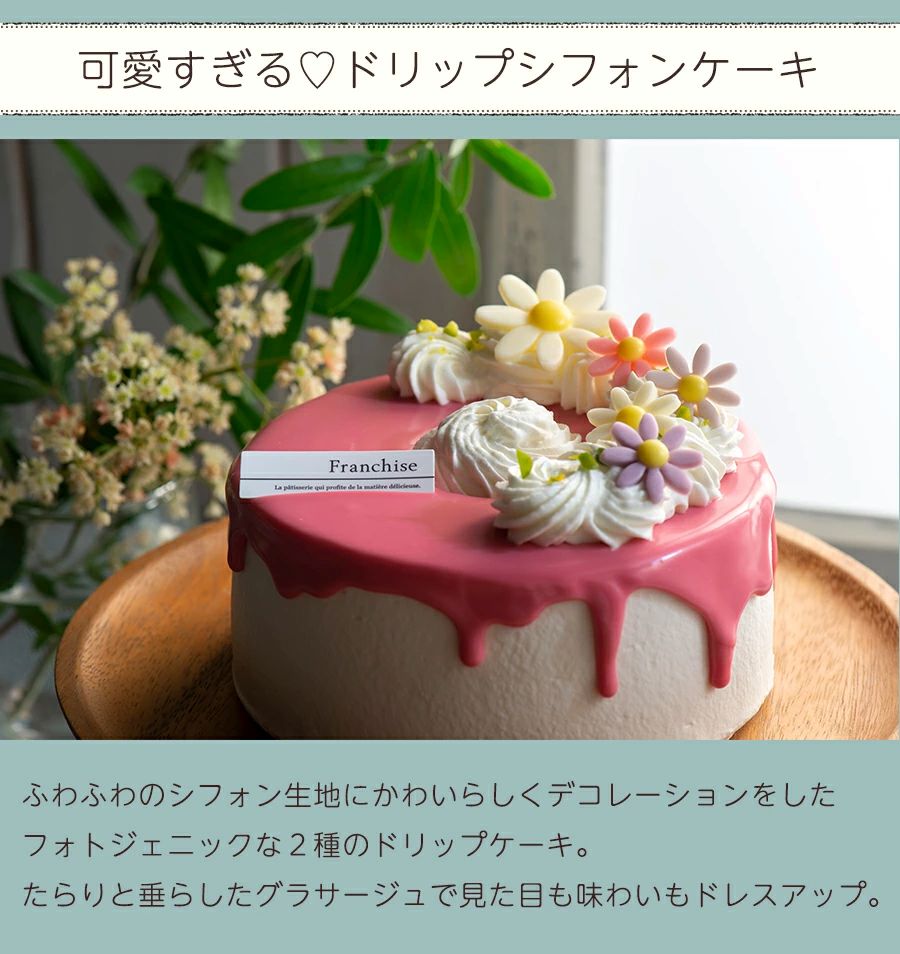 ふわふわのシフォン生地にかわいらしくデコレーションをしたフォトジェニックな2種のドリップケーキ。