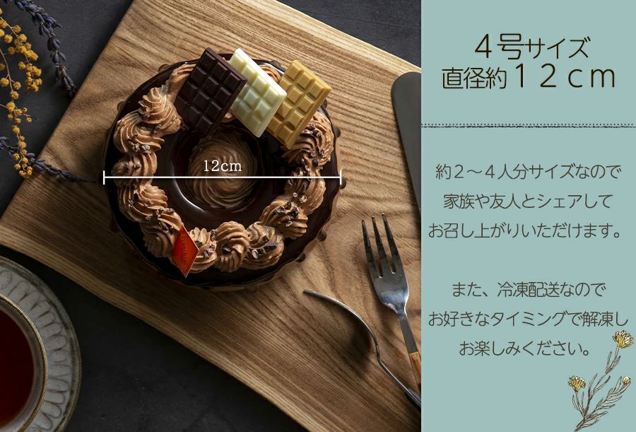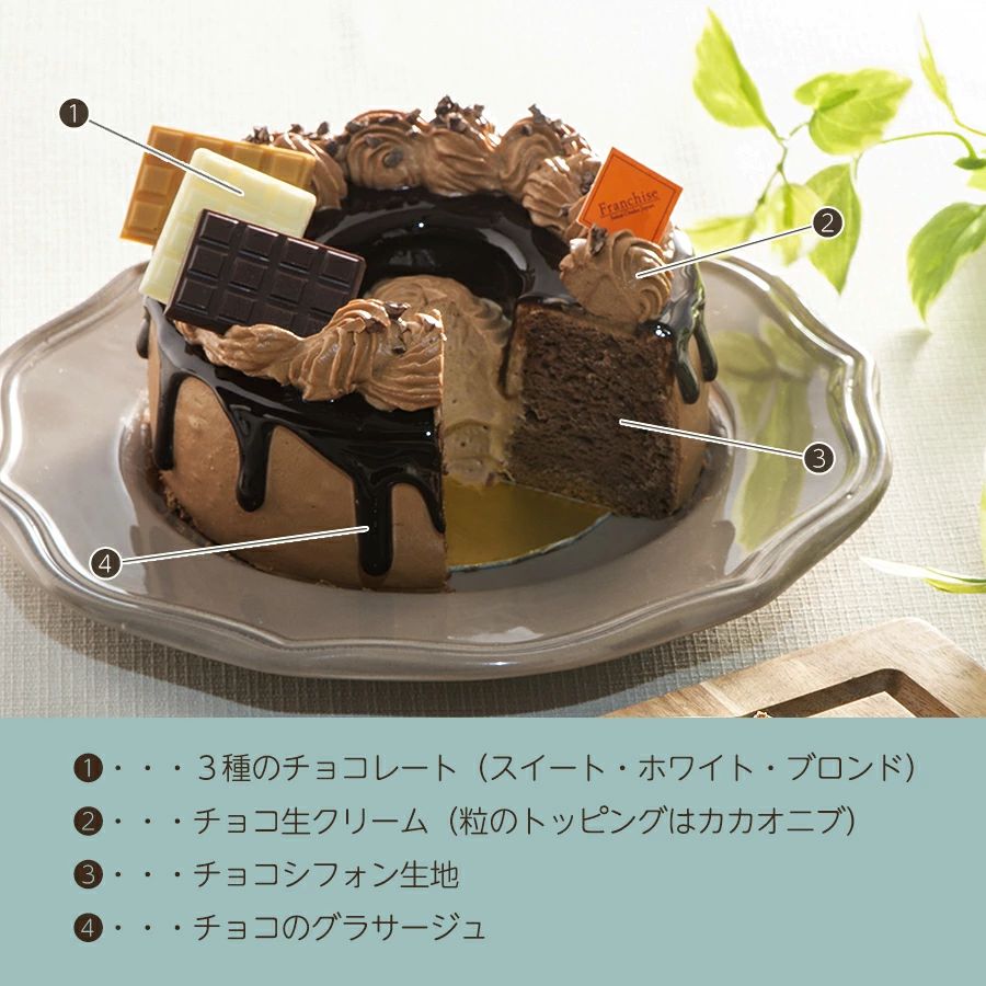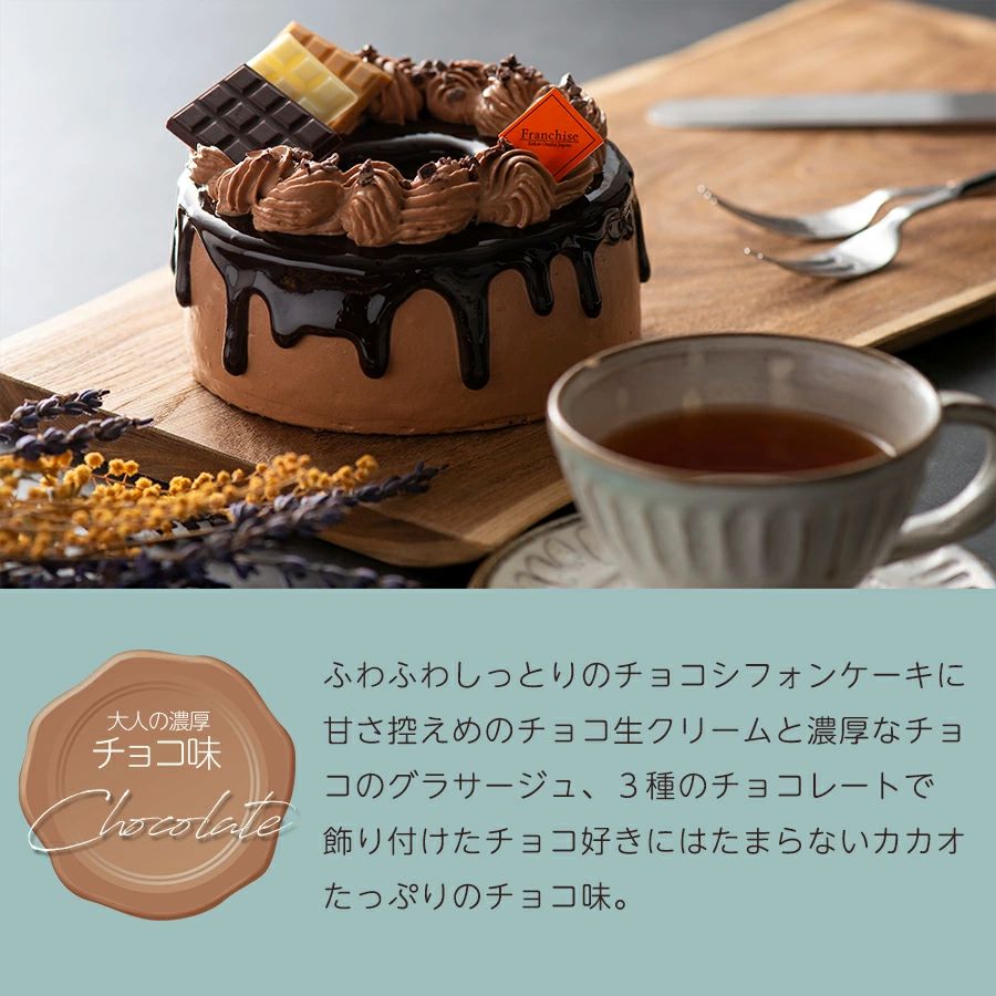 ふわふわしっとりのチョコシフォンケーキに、甘さ控えめのチョコ生クリームと濃厚なチョコのグラサージュ、3種のチョコレートで飾り付けたチョコ好きにはたまらないカカオたっぷりのチョコ味。