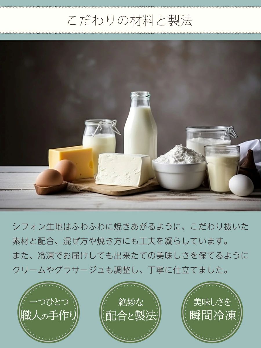 シフォン生地はふわふわに焼きあがるように、こだわり抜いた素材と配合、混ぜ方や焼き方にも工夫を凝らしています。