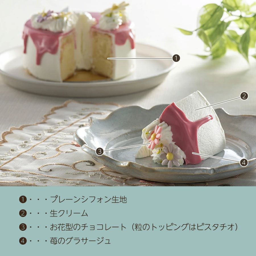 ふわふわのシフォン生地に、とろりと垂れるグラサージュが目を引くこのケーキは、まさにフォトジェニック。特別な日の彩りや、大切な人への贈り物にもぴったりな一品です。
