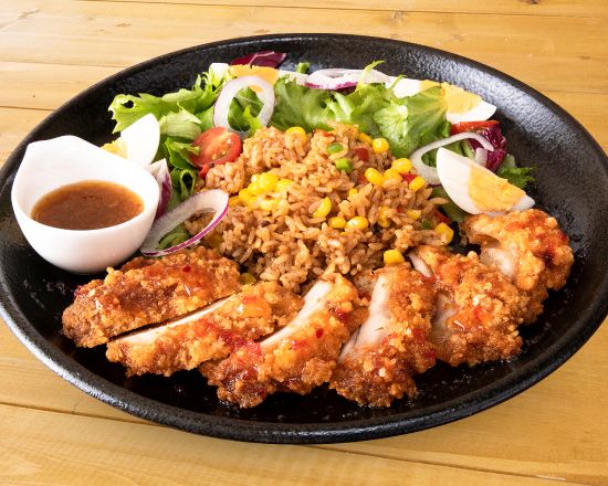 自慢のメキシカンピラフに大きくなったタツタチキンを添えました。