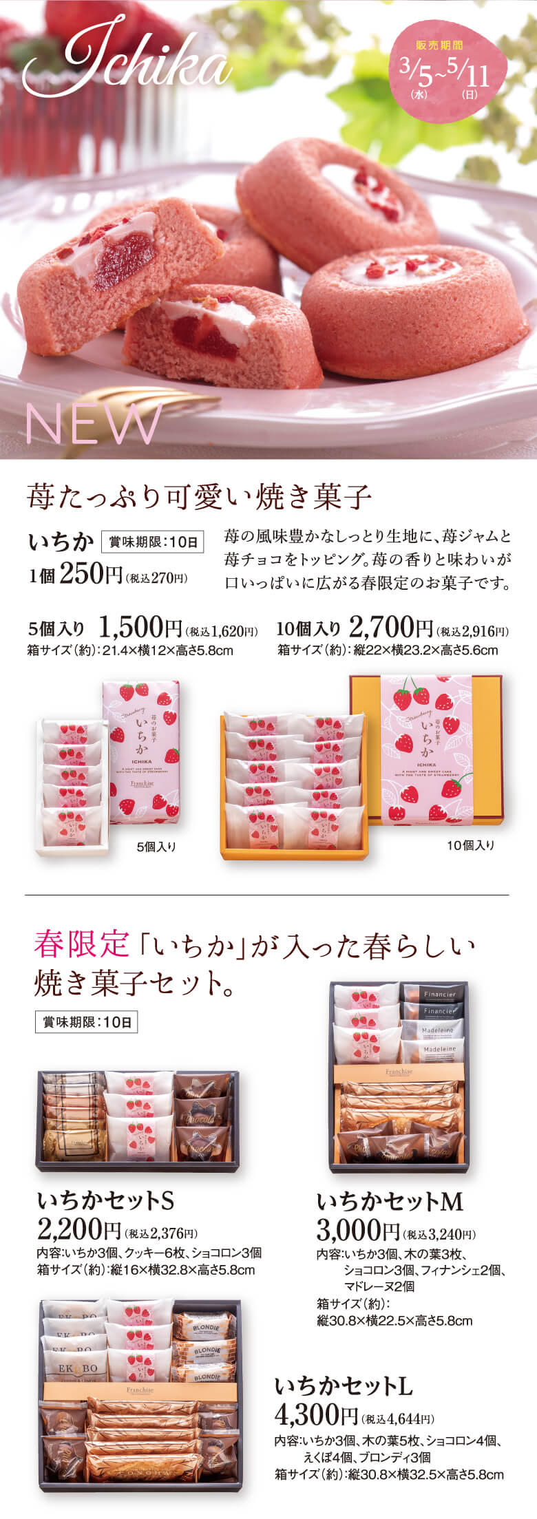 この春限定の「いちか」「さくらパイ」をはじめ、春を感じるスイーツを詰め合わせたギフトセットもご用意。大切な人への贈り物や、春のお祝いにぴったりのラインナップです。