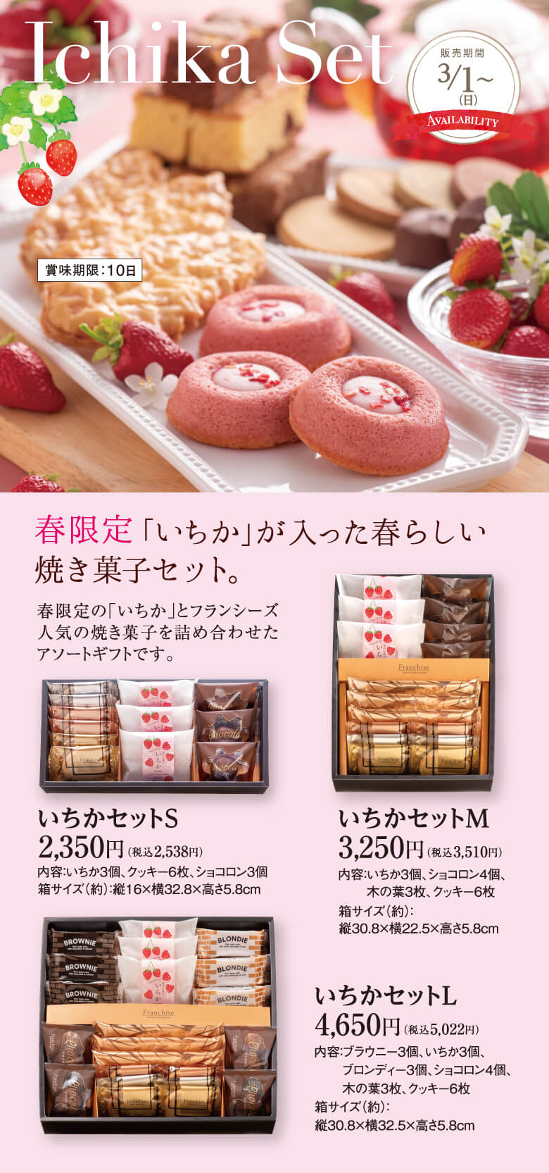 手土産に大活躍!「いちかセット」 春限定の「いちか」と、フランシーズで人気の焼き菓子を詰め合わせたアソートギフトです。 ご予算に合わせてS・M・Lサイズから選べますよ♪