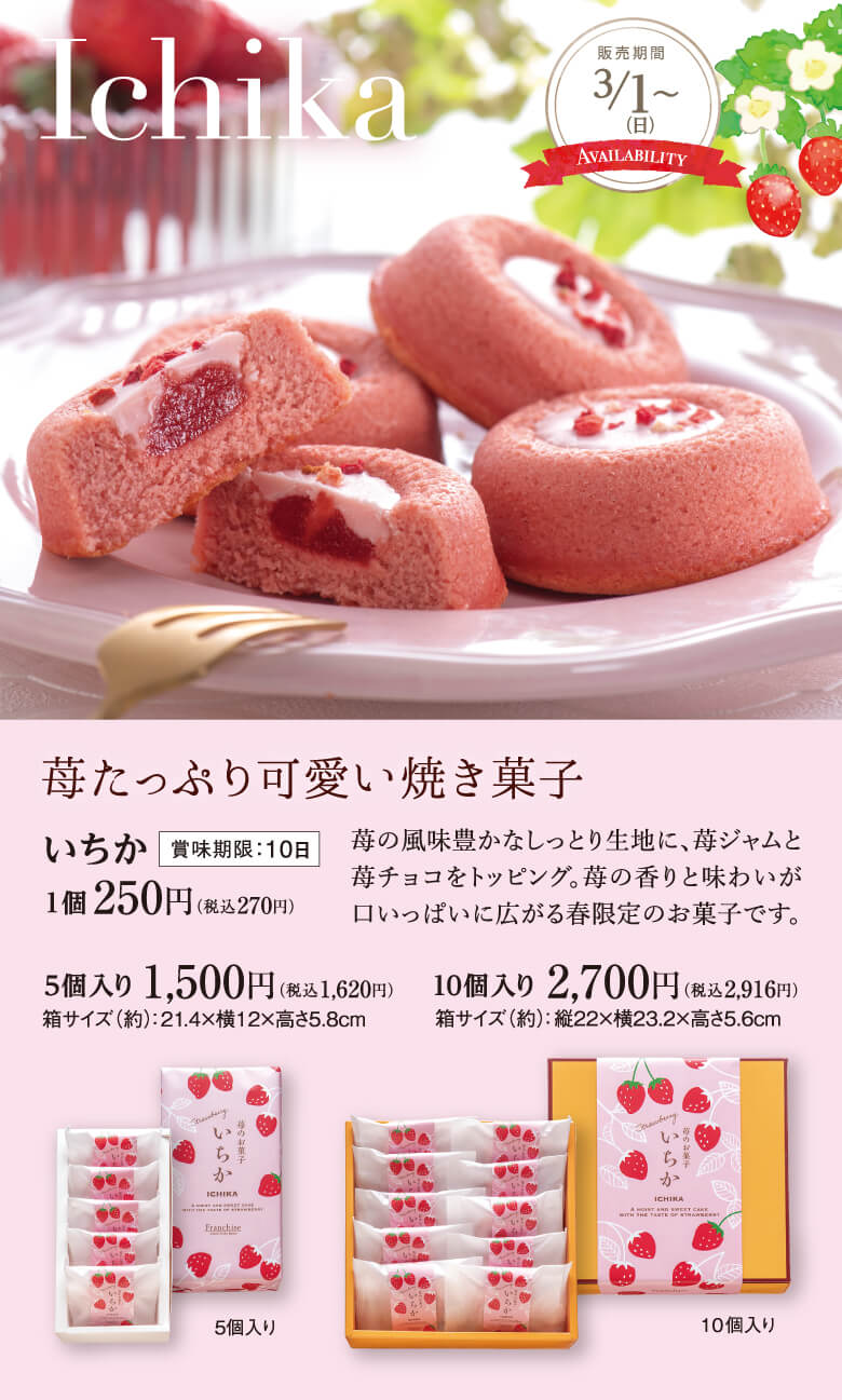 苺たっぷり可愛い焼き菓子「いちか」 苺の風味豊かなしっとり生地に、苺ジャムと苺チョコをトッピング! 苺の香りと味わいが口いっぱいに広がる春限定のお菓子です。 (1個:税込270円 / 5個入り:税込1,620円 / 10個入り:税込2,916円)