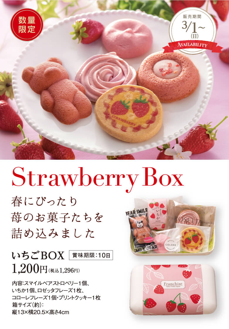 【数量限定】キュートな「いちごBOX」 可愛いスマイルベアストロベリーやいちか、プリントクッキーなど、春にぴったりな苺のお菓子たちが詰め込まれたBOX! (税込1,296円)