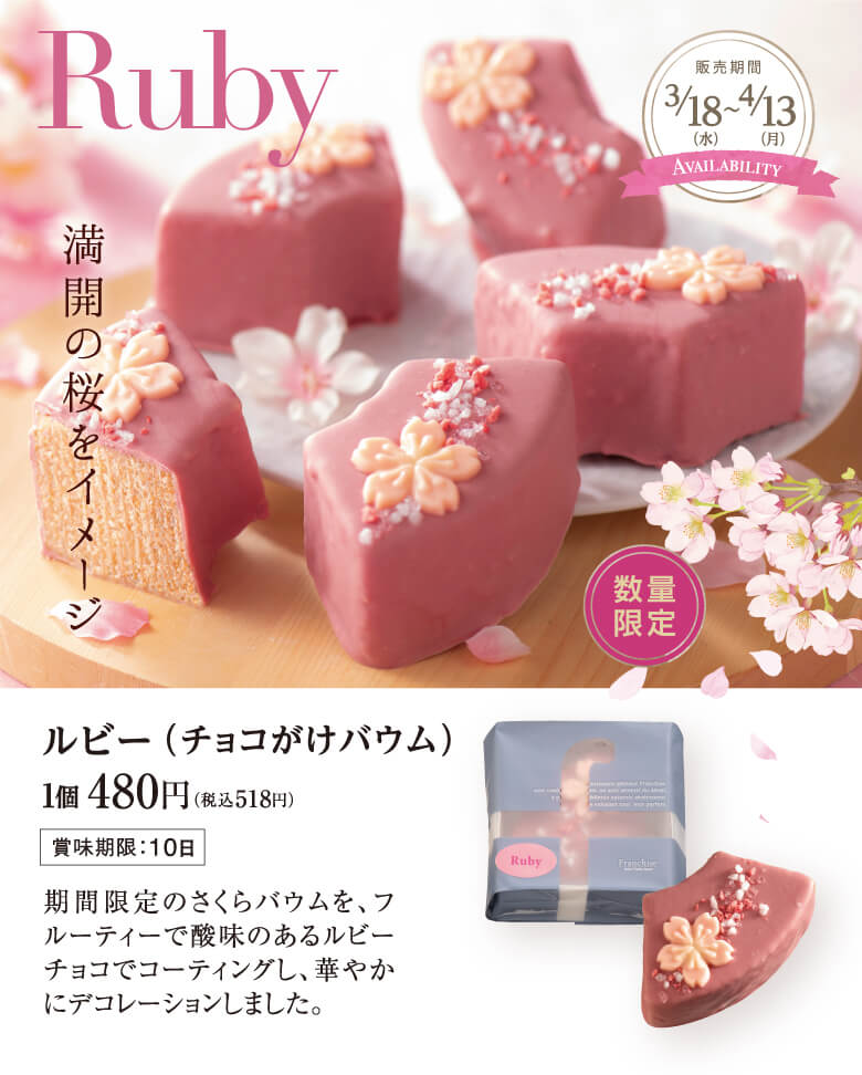【数量限定】満開の桜をイメージ「ルビー(チョコがけバウム)」 期間限定のさくらバウムを、フルーティーで酸味のあるルビーチョコでコーティングし、華やかにデコレーション! (3/18〜4/13販売、1個:税込518円)