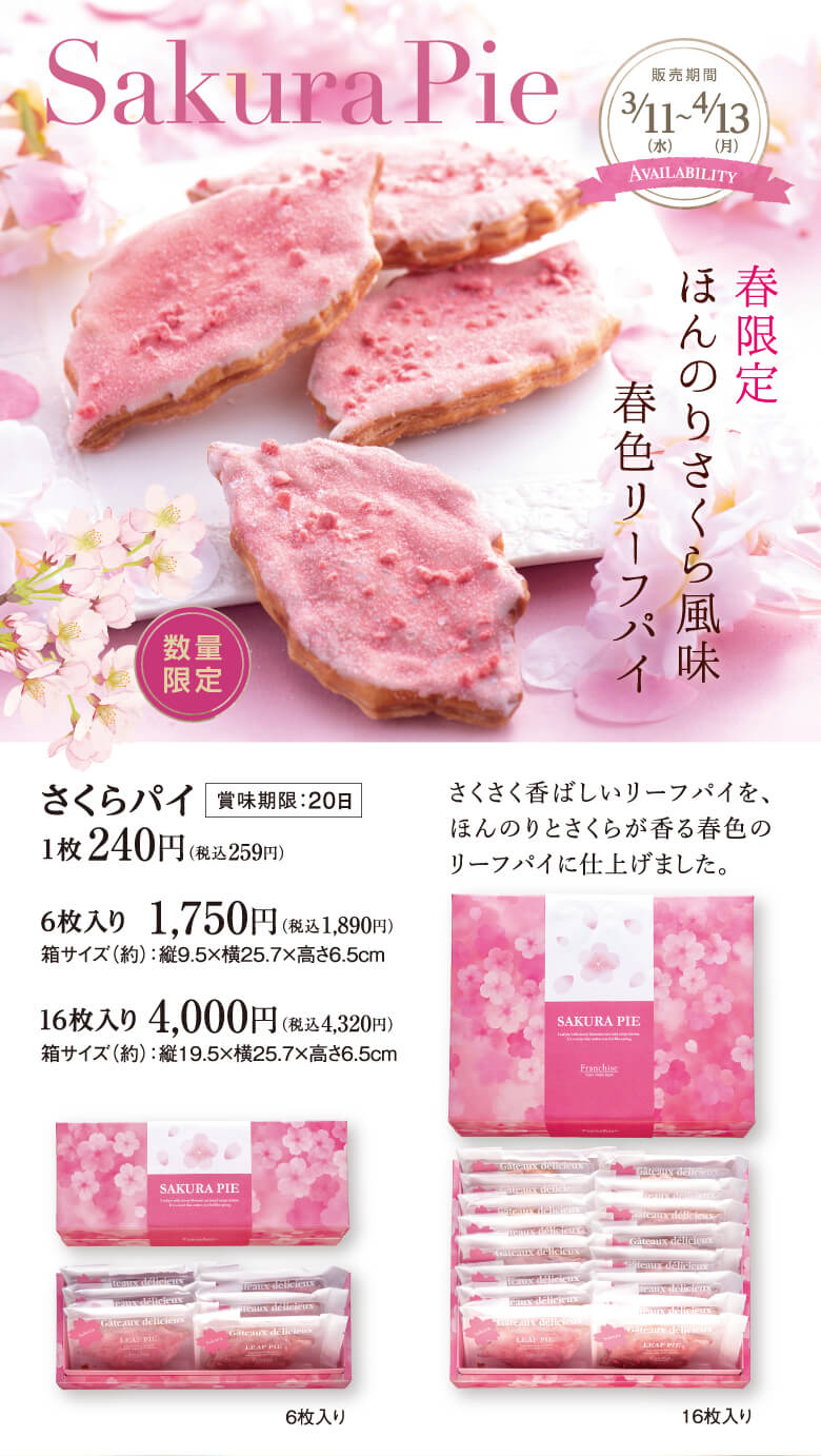 春色リーフパイ「さくらパイ」 さくさく香ばしいリーフパイを、ほんのりさくらが香る春色に仕上げています! パッケージも桜柄で贈り物に最適です。 (3/11〜4/13販売、1枚:税込259円から)