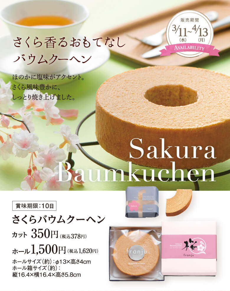 さくら香るおもてなし「さくらバウムクーヘン」 ほのかに塩味がアクセント! さくら風味豊かに、しっとり焼き上げられたバウムクーヘンです。 (3/11〜4/13販売、カット:税込378円 / ホール:税込1,620円)