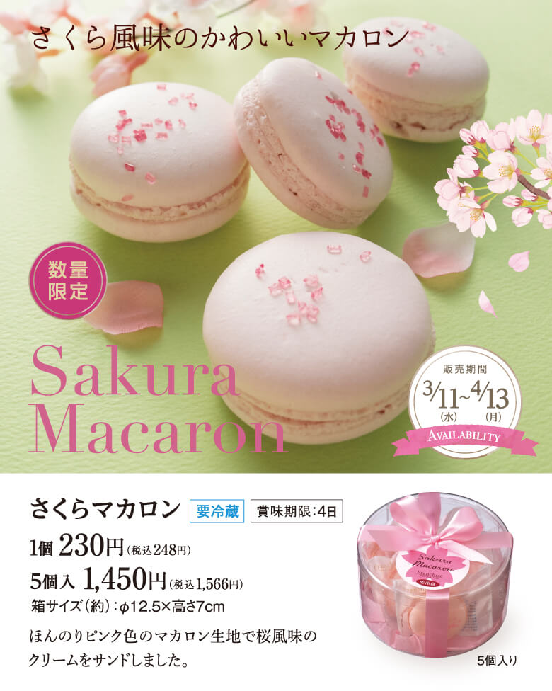 【数量限定】さくら風味のかわいい「さくらマカロン」 ほんのりピンク色のマカロン生地で、桜風味のクリームをサンドしました。 (3/11〜4/13販売、1個:税込248円 / 5個入り:税込1,566円)