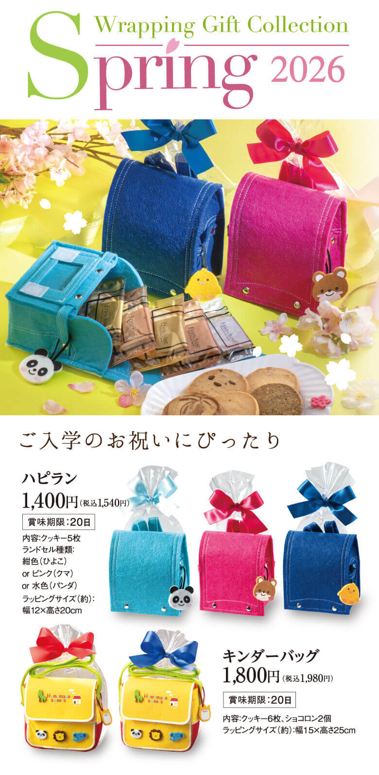 ハピラン:1,400円(税込1,540円) 本物そっくりの可愛いランドセル型ギフト! 紺色(ひよこ)、ピンク(クマ)、水色(パンダ)の3種類から選べます。 中にはクッキーが5枚入っていますよ♪