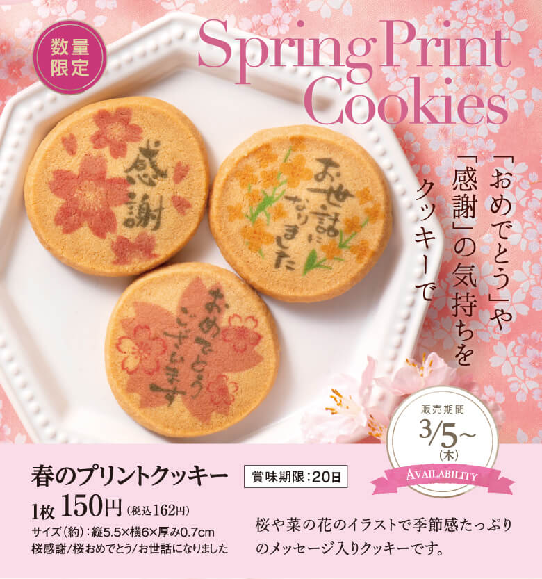春のプリントクッキー:1枚 150円(税込162円) 「感謝」「お世話になりました」「おめでとうございます」のメッセージがプリントされた、桜や菜の花のイラストが春らしいクッキーです。 ※3月5日(木)からの数量限定販売です!