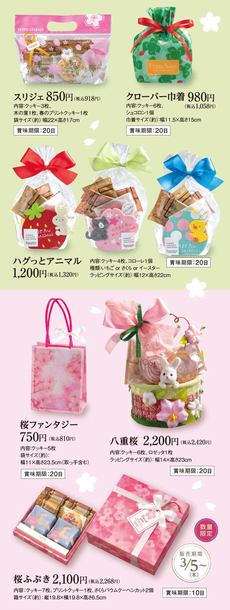 桜ふぶき:2,100円(税込2,268円) クッキー7枚、プリントクッキー1枚、さくらバウムクーヘンカット2個が入った豪華なボックス。 こちらも3月5日(木)からの販売です。