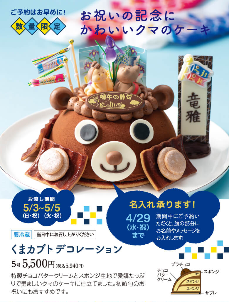 特製チョコバタークリームとスポンジ生地で愛嬌たっぷりで勇ましいクマのケーキに仕立てました。初節句のお祝いにもおすすめです。