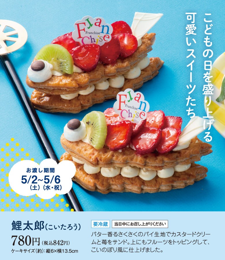 堺市中区の深井駅から徒歩8分。メイプルタウンの人気スイーツ店『花とお菓子の工房 フランシーズ』では、お子さまのすこやかな成長を願って家族みんなで祝う、こどもの日にぴったりなケーキの予約が始まっていますよ。