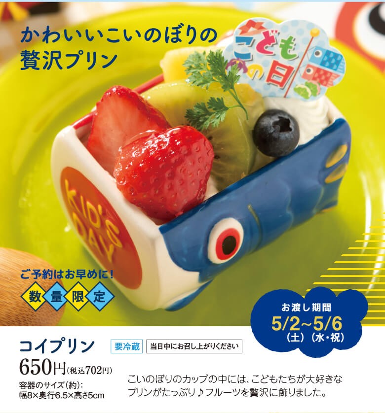 こいのぼりカップの中には、こどもたちが大好きなプリンがたっぷり♪フルーツを贅沢に飾りました。