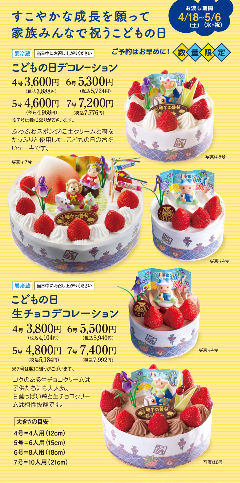 ふわふわスポンジに生クリームと苺をたっぷりと使用した、こどもの日のお祝いケーキです。