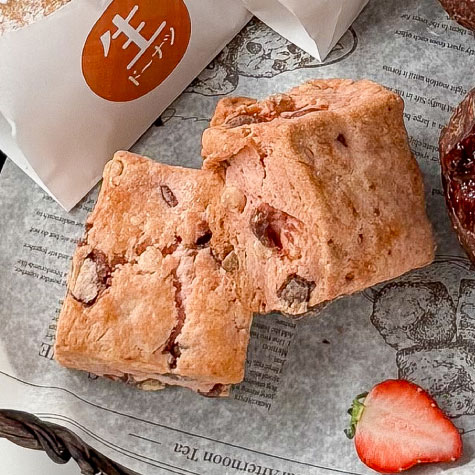 ホワイトチョコレートと、いちごチョコレートが入ったくちどけやさしいスコーンです。