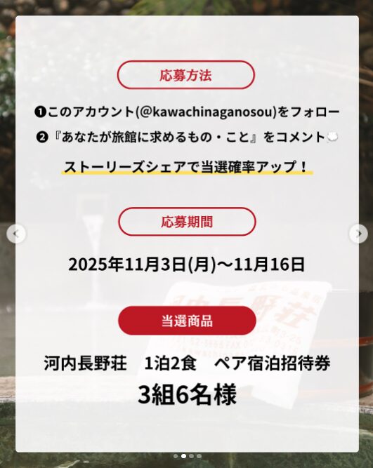 無料宿泊券が当たるチャンスは、Instagram(@kawachinaganosou)で簡単に参加できます!