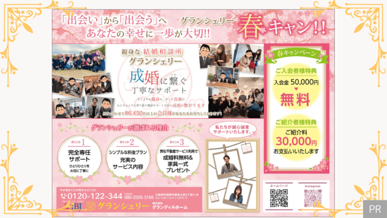 オンライン上での活動サポートが主流となってきている時代ですが、グランシェリーでは対面面談・徹底した同行サポートを主軸に会員様との信頼関係、コミュニケーションを何よりも大切に作業的ではない二人三脚で築き上げていく楽しい婚活を心掛けております。