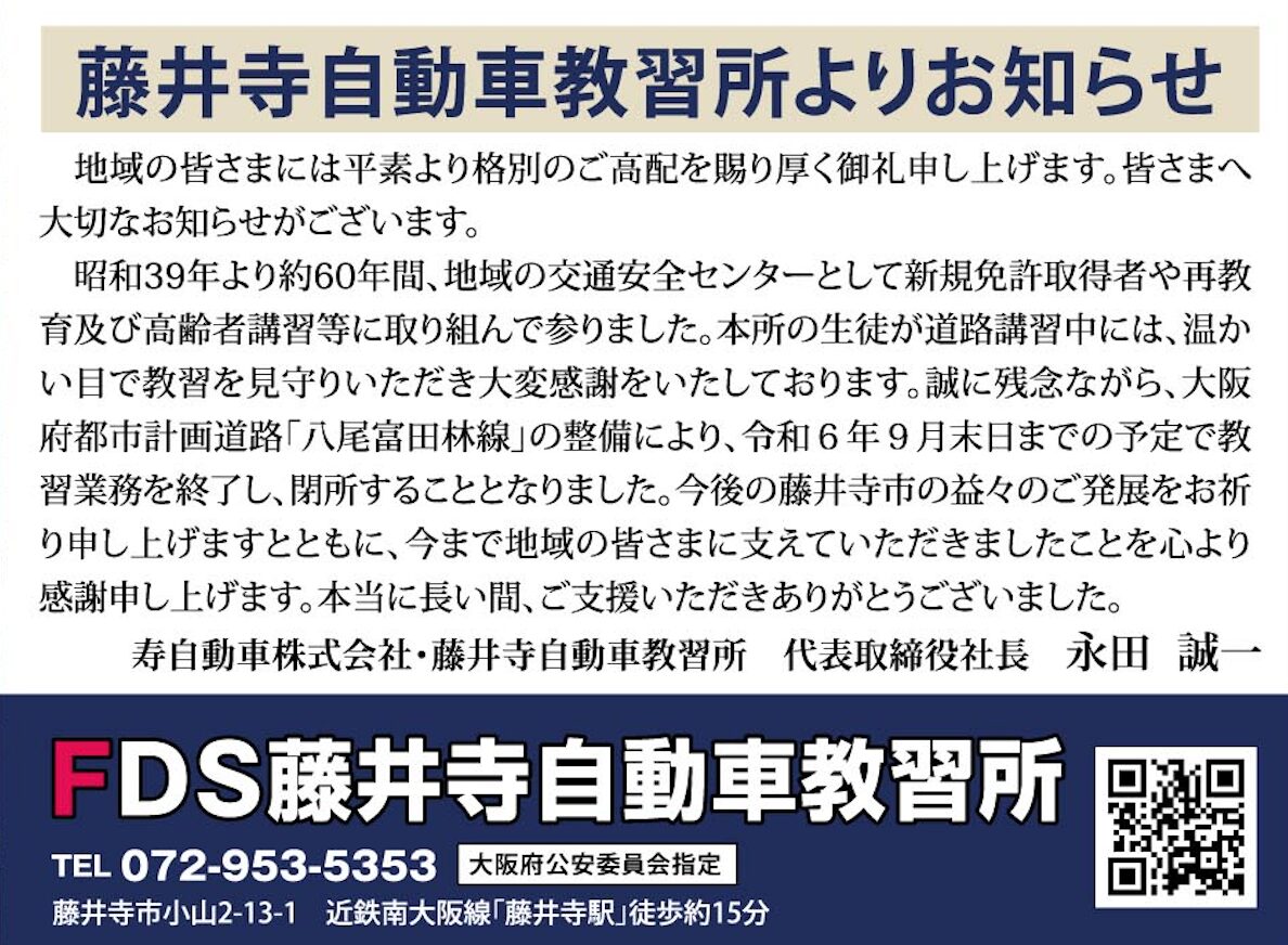 誠に残念ながら、大阪府都市計画道路「八尾富田林線」の整備により、令和6年9月末日までの予定で教習業務を終了し、閉所することとなりました。今後の藤井寺市の益々のご発展をお祈り申し上げますとともに、今まで地域の皆さまに支えていただきましたことを心より感謝申し上げます。本当に長い間、ご支援いただきありがとうございました。
