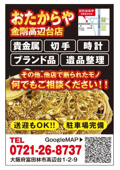 おたからや金剛高辺台店では、貴金属、切手、時計、ブランド品、遺品整理等…多種多品目の買取をいたしております。