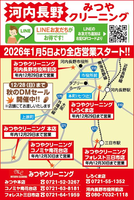 お近くのみつやクリーニングはココ!<河内長野市内の5店舗情報>