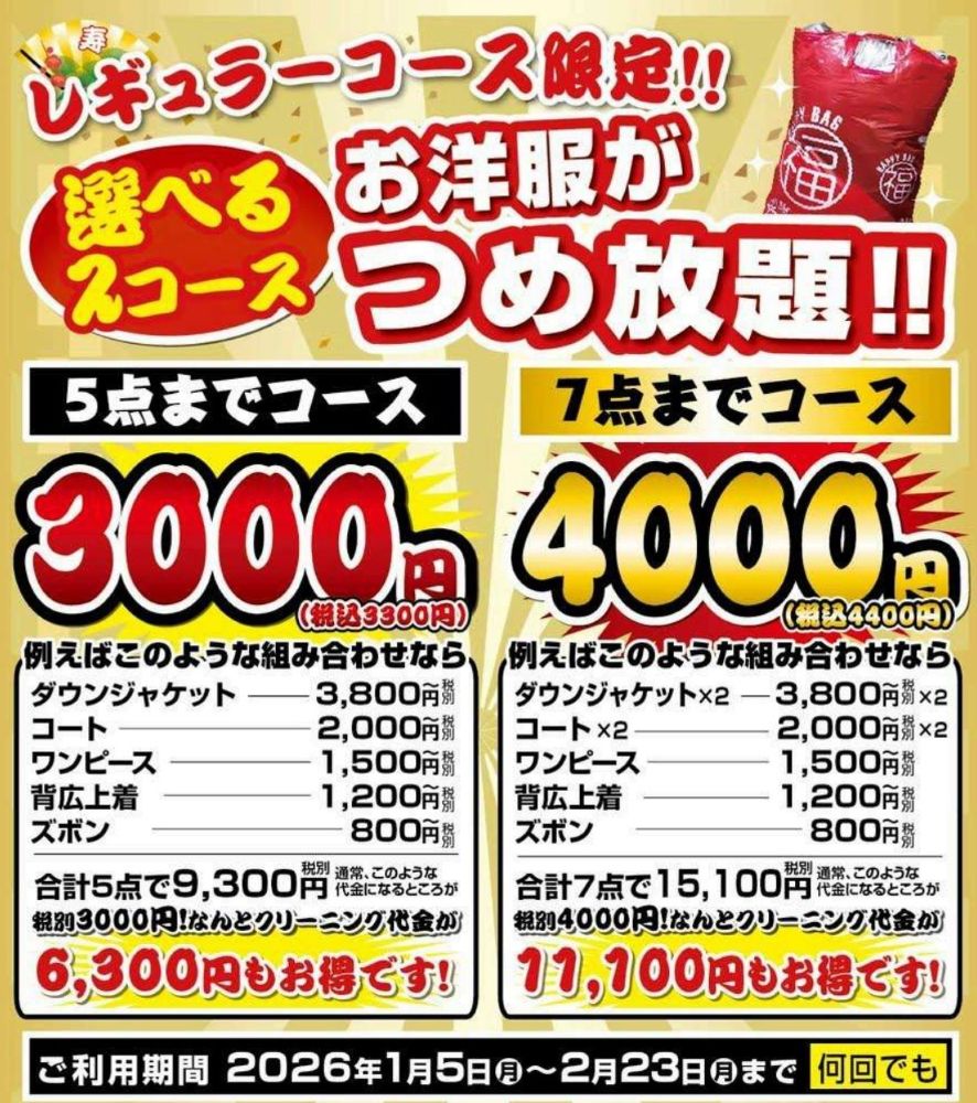 例えば、ダウン2着、コート2着、ワンピースにスーツ…と入れていくと、通常15,000円超えの内容が4,400円(税込)で済んじゃうんです!