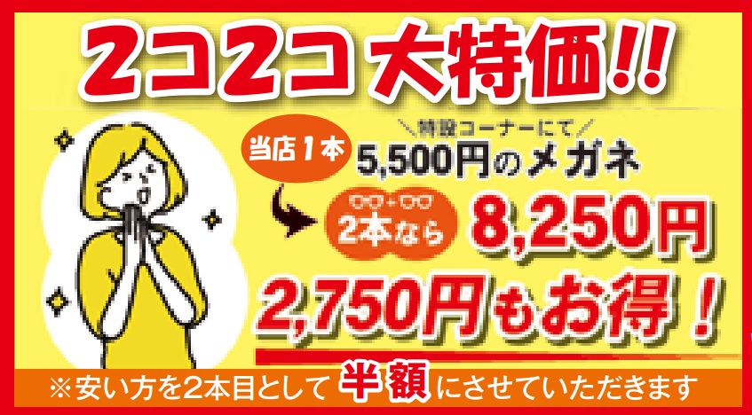 1本5,500円(税込)のメガネを2本買うと、なんと2本で8,250円(税込)になっちゃうんです!