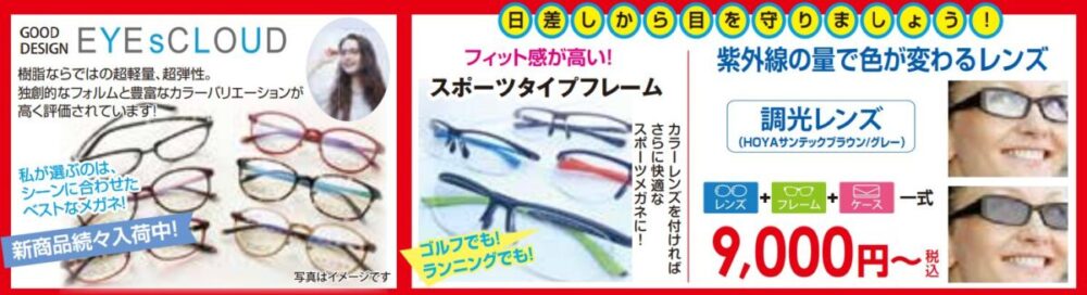さらに、フィット感が高くゴルフやランニングにおすすめのスポーツタイプフレームや、紫外線の量で色が変わる調光レンズ(HOYAサンテックブラウン/グレー:一式9,000円(税込)〜)も取り扱っています。
