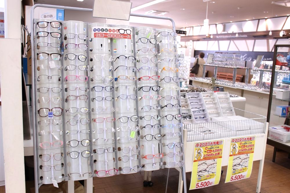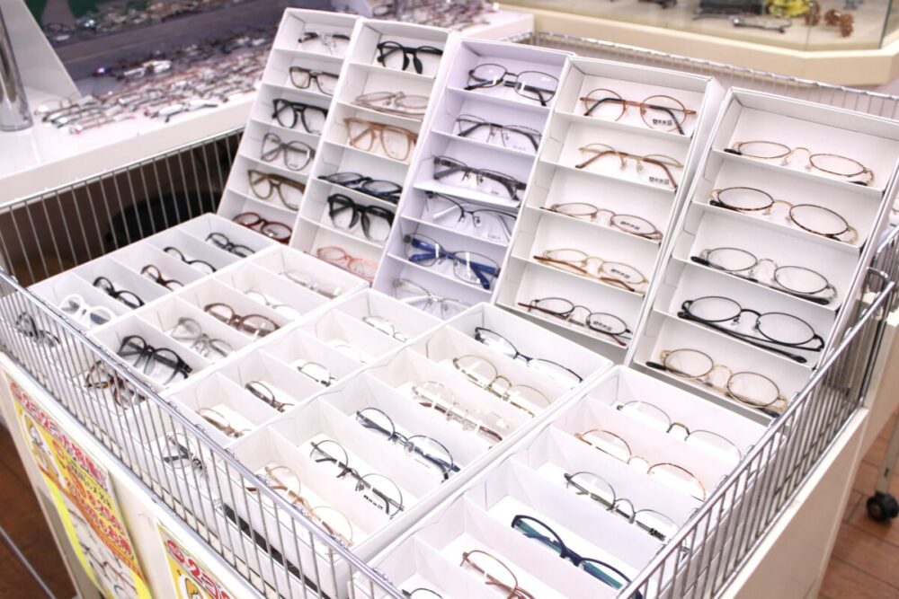 なんと、レンズ(1.56AS使用)+フレーム+ケースが一式で5,500円(税込)均一のコーナーがあるんです。