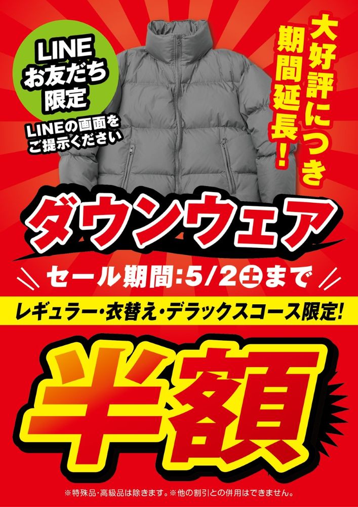 なんとなんと!2026年5月2日(土)までの期間限定で、ダウンウェアのクリーニングが半額になるキャンペーンが開催中です!