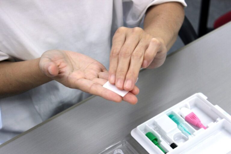 指先が乾いたら…ランセットという器具を使用して出血させます。