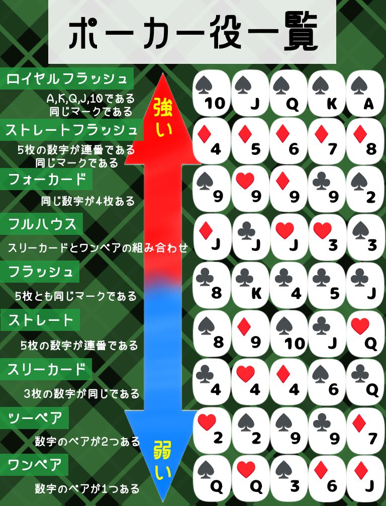 自分だけのカード2枚と、共通カード5枚の計7枚のうち、5枚だけを使用して役を作ります。
